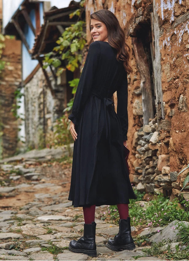 Button Closure V Neckline, Elastic Ruffle Hem, Long Sleeve, Fit And Flare Midi Dress