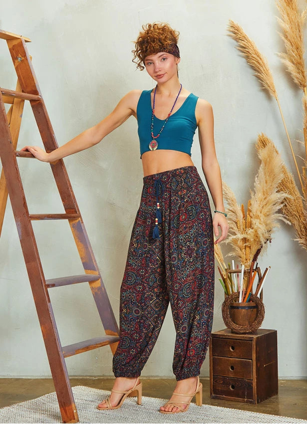 Elastic Waist and Hem, Natural Bead Detail, Drawstring Harem Pants
