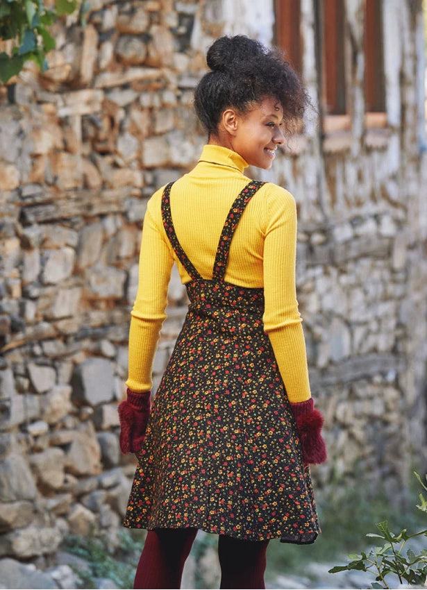Floral Print Cotton Suspender Strap Dress - Navy Blue