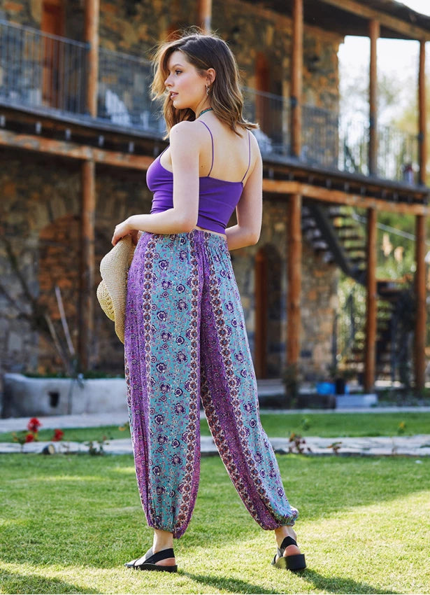 Floral Printed Elastic Waist and Hem Mid Rise Harem Pants