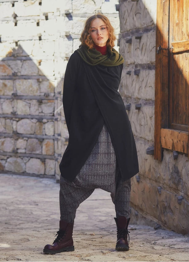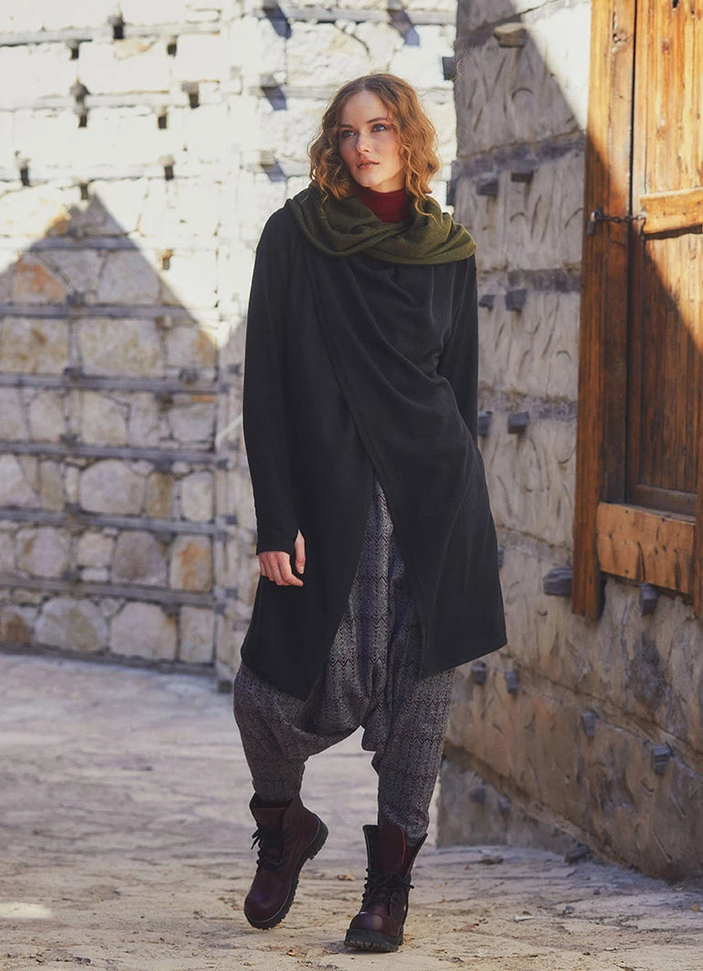 Thumb Hole Detailed Bohemian Style Hooded Long Black Cardigan